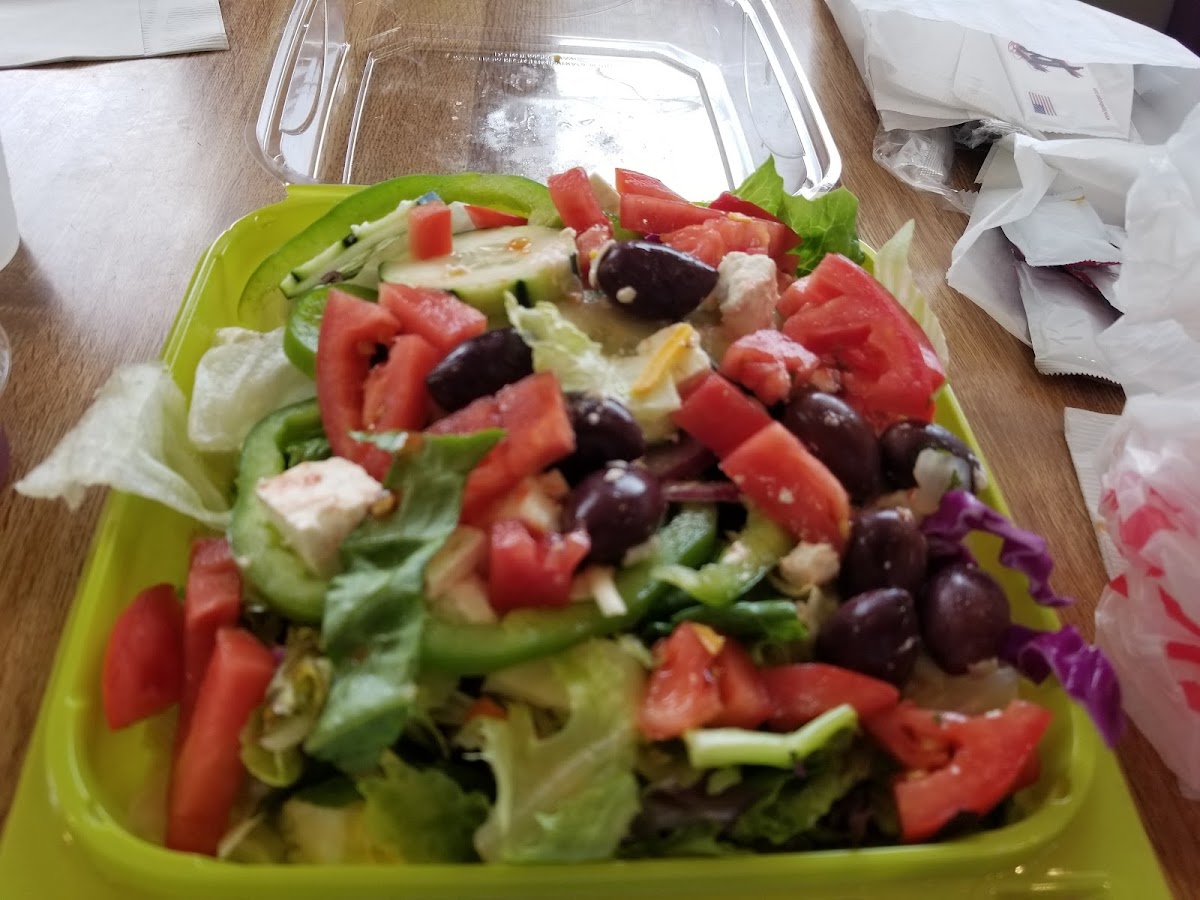 Greek Salad with Kalamata Olives Feta Cheese Bell Peppers Croutons Olives Onions and Cucumbers